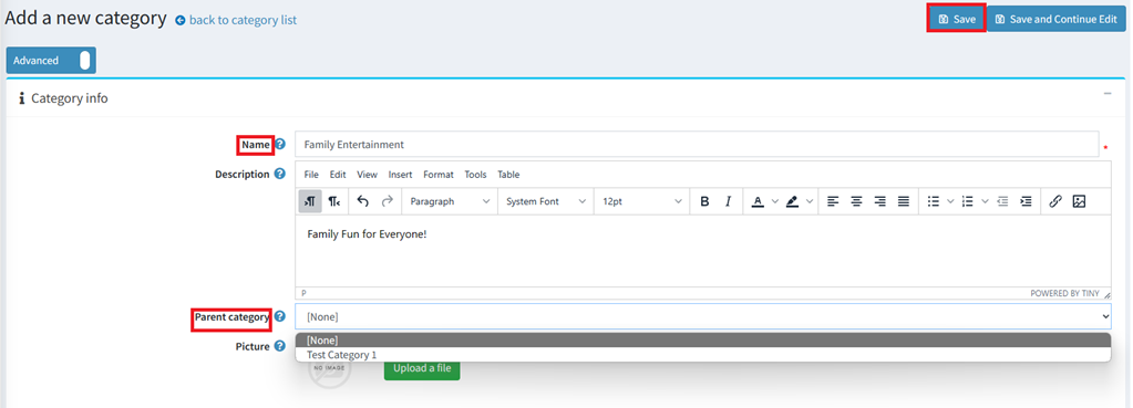 To create the category, you can enter a Name and Save, but you also have the option to add a description or an image and attach it to another category. Click ‘Save’.